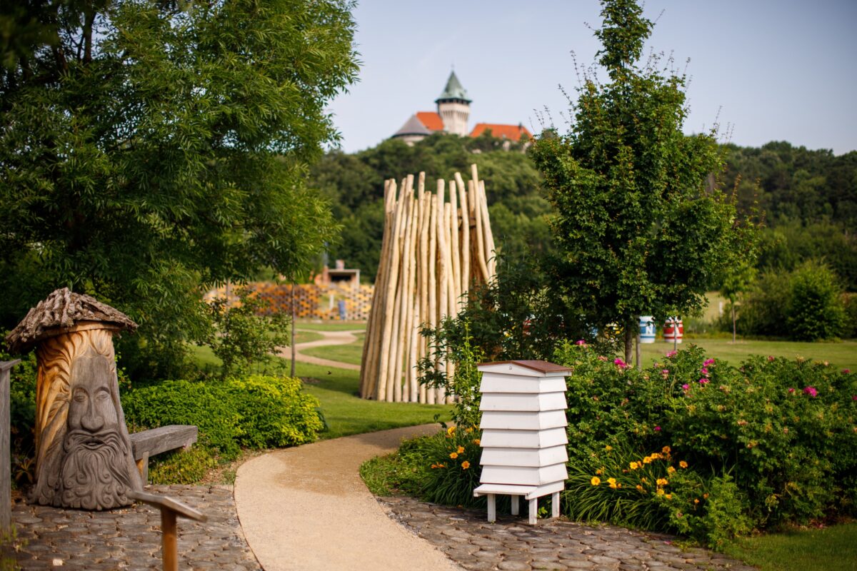 Záhrada prezentuje včelárstvo a spracovanie včelích produktov zaujímavou formou – prostredníctvom umelecky stvárnených edukatívnych prvkov. Jej charakter nadväzuje na okolitú krajinu. V záhrade máme väčšinu rastlín domáceho pôvodu, ovocné a jedlé druhy doplnené trvalkovou výsadbou, kvetmi a bylinkami tak, aby vytvorili celoročne farebnú oázu pod Smolenickým zámkom. Z bohatej zmesi pestrofarebných včelomilných rastlín u nás nájdete rôzne historické alebo pôvodné druhy ovocín, okrem iného dula, mišpuľa alebo oskoruša, či štepence nekvitnúcej jablone zo záhrady Juraja Fándlyho z neďalekého Naháča. V našej záhrade chceme zážitkovou formou predstaviť verejnosti dôležitosť drobnučkých opeľovačov pre náš svet. Objektami z rúk lokálnych umelcov a remeselníkov chceme inšpirovať k zamysleniu nad darmi prírody, ktoré často berieme ako samozrejmosť. Nájdete tu napríklad bludisko z tisícok kvetov „Raj Srdca“, včelí tanec, gigantické peľové zrná, hmyzí hotel, včelie obydlia, dutý strom, bylinkový záhon, a mnohé ďalšie.